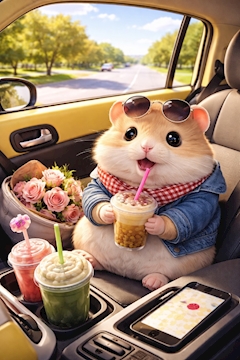こんにちわ けいです⑅︎◡̈︎* チャッピーに作ってもらった ハムとのドライブ画像 めちゃ楽しそう😆♪ 現実になれば良いのなぁーー