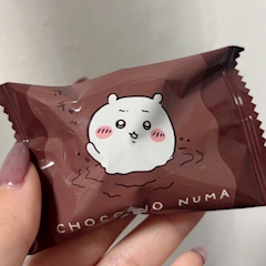 Pantherの りお です💜 この前かわいいチョコおすそ分けしてもらったの✌️ CHOCO NO NUMA(チョコの沼)って書いてあってちいかわが溺れてるの😭 大変なところ申し訳ないけどかわいい💭 別に包装を保管するわけじゃないけど 横から丁寧に開けて食べました😂