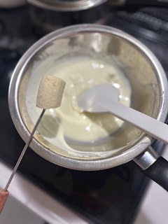 こんにちは✨️ななです🎀❕ ちょこばななの途中経過!!💕家で食べるちょこばななはいつも切って小さめサイズにしてる!!🥹チョコ溶かす時はお水厳禁!!!! お家でチーズフォンデュとかめっちゃするからちゃんと専用の串あるのおもしろい笑笑串に刺してクルってちょこに潜らすだけ‼️‼️あとはボウルの端でとんとんして余計なチョコを減らすよ〜!!!💕💕 私は薄めのパリパリが好きだからめちゃくちゃ極薄にしてる!!笑冷蔵庫ですぐ固まるしほんとにおすすめ🥹 テンパリングも上手にできてて安心!!!🥹作業時間5分もかからんからおやつにありがたい