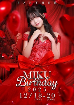 こんばんは! Pantherガールのタナカです🐱 気が付けば12月も真ん中 2日間お休みだったんですが 日付を書く度に え??? もう15日すぎてる??ってなってます ヤバい 全てが私の体感と追いついてなくて 取り残されてます笑笑 昨日ネイルを 変えに行って ネイリストさんと お話してる時に あ〜やばい今年が終わる ってのを さらに体感しました😇 年末年始の 話してたけど 私はもちろん全部 Pantherにいます😊 クリスマスケーキの話も そうですねーって 聞いてたんですけど 全て出勤です!!! フゥー⬆️ 昨日から Pantherでは ミクさんバースデーイベントを 開催しております! 大人っぽいのに 可愛い赤色をテーマにした ミクさんバースデー✨ 本日も 盛り上がってまいりますので どうぞよろしくお願いします🙇♀️ 最後まで読んでくれてありがとう💖