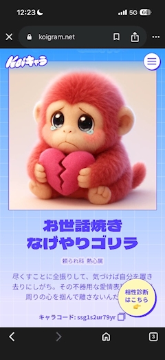 やっほ〜Pantherのさくです! なんか友達にすすめられて 恋キャラ診断してみたんだけど お世話焼きなげやりゴリラwwwww 悪口? なんか取扱説明書とかあった笑 これなんか相性診断もできるらしいから 友達同士でみんなもやってみてね( ˶ˆ꒳ˆ˵ ) 今日17:30から!𐔌ᐡ- ·̫ •ᐡ𐦯ฅ