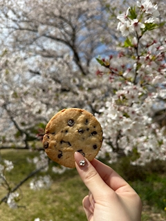こんにちは✨️Pantherのななです🎀❕ この前のお花見でチョコチップクッキー焼いてった🍪💕最近は大きめサイズ作るのハマっててどデカい!!味はプレーンとイチゴ!🍓 桜とクッキーの相性良すぎてかわいい🌸お弁当作りたかったけど時間なかった絶対また行く(T_T)
