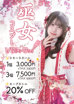 こんにちは✨ 🐈⬛Pantherです🐈⬛ 🐈⬛タイトルの通り巫女コスプレは本日までとなりますにゃ🩷 🐈⬛ぜひ錦のパワースポット(?)で今年の運気をあげていきましょうにゃあー😸 🐈⬛ 🌸巫女コスプレイベント⛩️ 1/13(火)〜1/17(土)イベント開催致します! ⛩️巫女⛩の衣装で新年最初のコスプレイベントをします! ❤️キャンペーン❤️キープボトル20%OFF🌸限定ドリンク🌸テキーラボール1個¥3,000(¥3,900)3個¥7,500(¥9,800) みなさまのご来店心よりお待ちしております🐾 最後まで読んでくれてありがとうにゃん🐈⬛